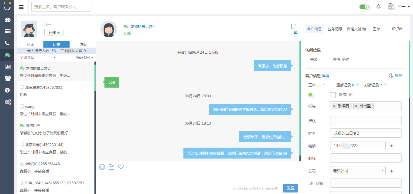 - 多渠道接入,客服可以在一个系统上对来自微信、IM、电话、APP等多渠道的客户咨询,并且进入系统的客户会自动形成线索便于客服后期跟进,将用户数据无遗漏的保留,这样在减少客服切换平台的同时,满足了客服处理大部分日常工作的需求。