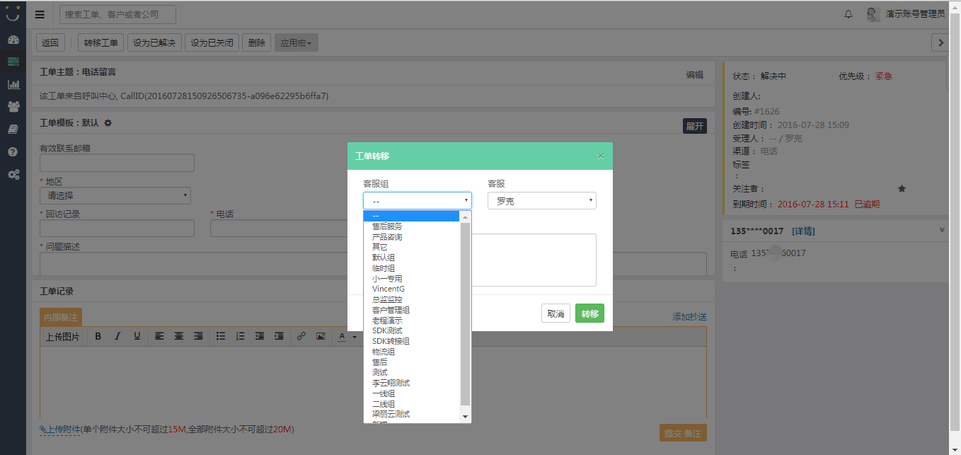 - 工单系统同样支持多渠道,无论哪个渠道的事情都可以使用工单进行记录,并且可以根据公司业务进行工单字段定义,内部流转方便,重要的事情优先处理,提高服务质量。